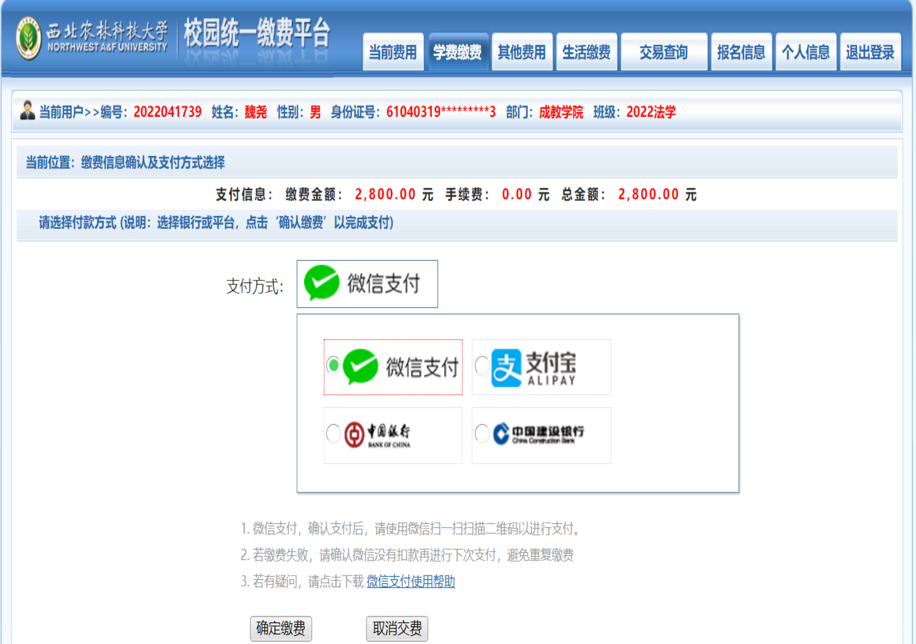 学生在西北农林科技大学校园统一缴费平台缴纳。学生登录平台后完善个人信息,缴费后支付成功截图发至相关教学点,支付成功截图作为教学点统计学生缴费的唯一依据。缴费操作流程见附件。