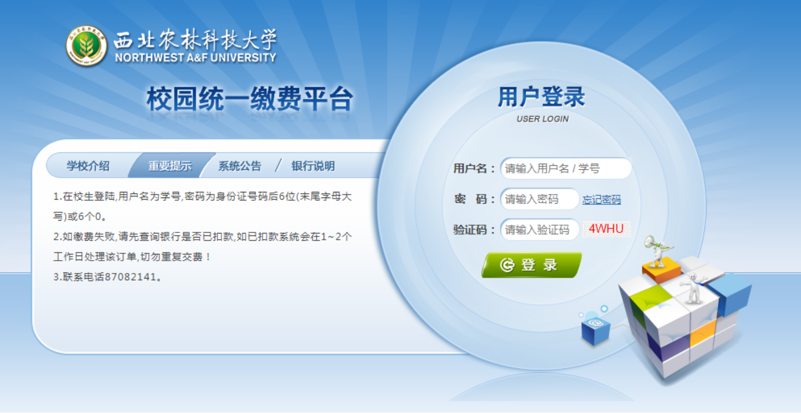 1、输入用户名和密码进入缴费平台。用户名为学号,密码为姓名首字母(大写)+身份证号码后6位,如“李美华”密码为“LMH050077”。