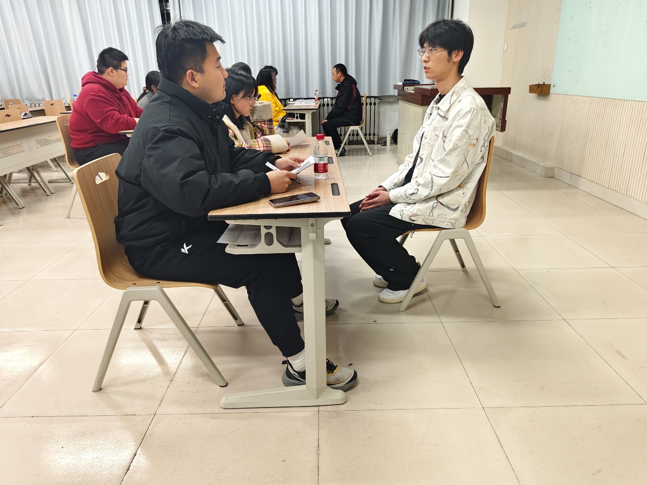 本次面试贴合学生特点,现场组织有序。在8114和8115教室,同学们依次进行自我介绍并接受动机考察。隔壁8116等待教室内,同学们手持报名表,或低声交流,或默念准备,眼中充满期待。面试现场气氛热情活跃,担任面试官的导员与主席团成员通过精心设计的问题,挖掘同学们的优良品质与真实想法,为赛事选拔合适的志愿者。