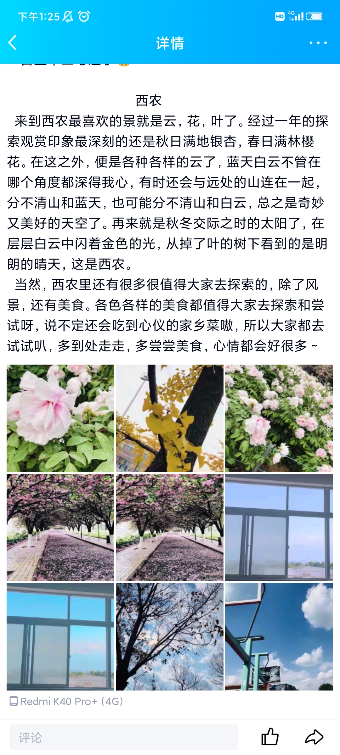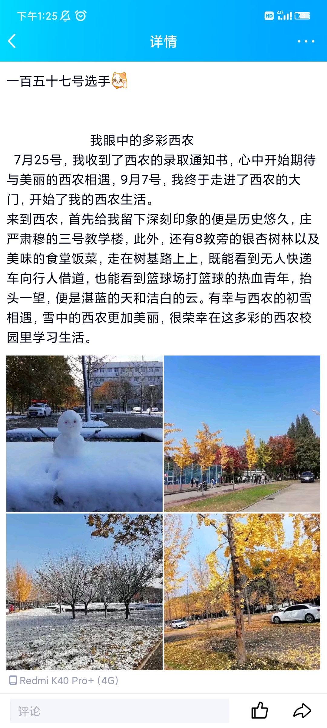 为了帮助91直播 新生更加了解熟悉校园,分享自己视角下的校园和初入校园的感受,增强同学们对校园的热爱,同时让在西农一年以上的学生分享自己对学校的认识,让大家在繁忙的功课之余,走向美丽的校园,感受自然的美,阳光团工委水建支部于2021年11月15日在线上举办了“我眼中的多彩西农”这一为期二十天的活动,下面让我来介绍活动中的一些情况。