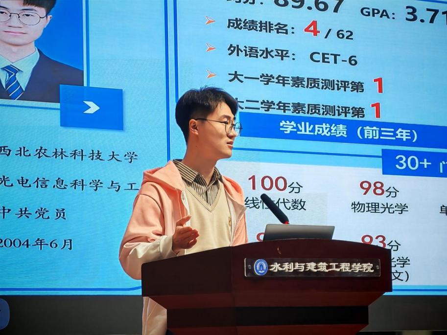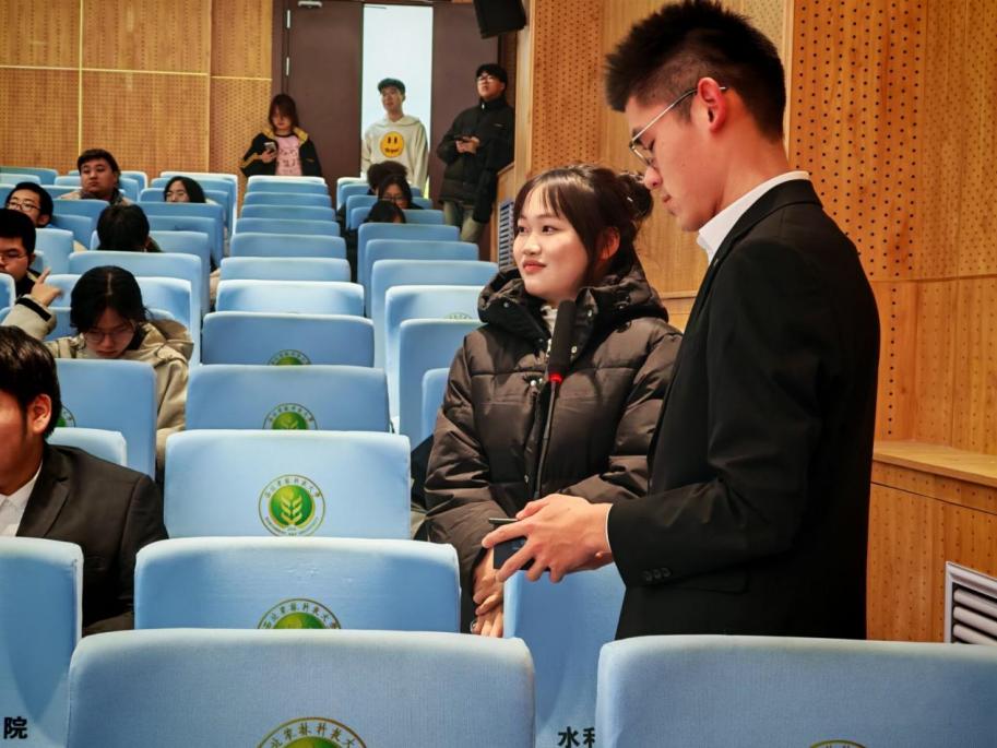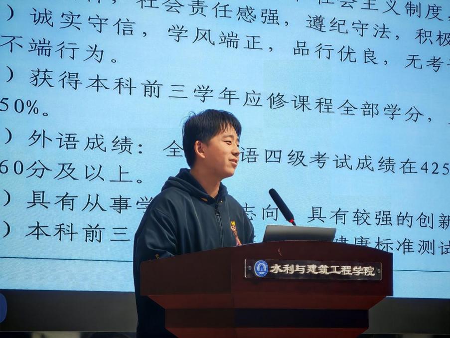 陆彦涵则以资环学院为例,为同学们深入解读保研成绩核算细则,具体说明了创新能力加分规则。同时结合参与校领导走访学生日、环保调研等实践经历,强调志愿服务、学生工作等综合素质在保研评价中的重要作用,为同学们提供了全方位的准备指南。
