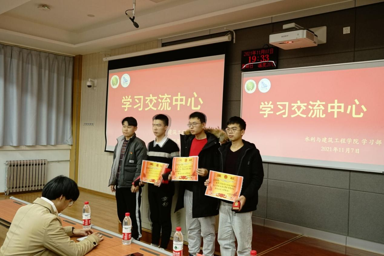 活动开始时,郝彦昕老师为优秀学生颁奖,在场人员以热烈的掌声祝贺获奖者。颁奖结束后由马越洋、王飞和兰安栋三位同学分别根据自己的大学生活及学习经验向在场的同学们提出建议。