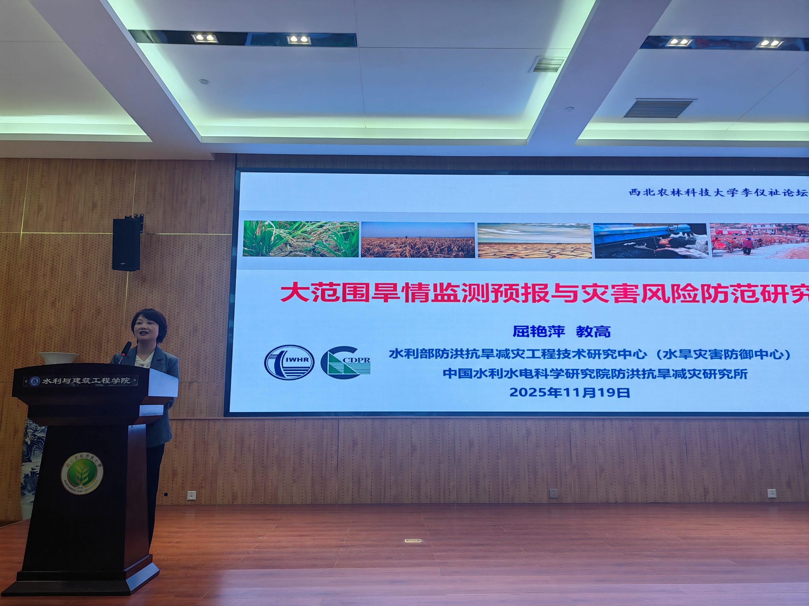报告会上,屈艳萍教高以2022年夏季长江流域大旱为例,系统介绍了旱情灾害监测与防范的研究背景和现实需求。随后,围绕“干旱成灾机理”、“旱情预测预报技术”、“旱情监测评估技术”、“旱灾风险评估技术”和“旱灾风险防范应对”五个方面,深入阐述了相关研究进展及团队最新研究成果,并就当前抗旱减灾研究中的关键任务与难点问题进行了剖析。最后,对未来研究方向提出展望,指出应重视面向承灾对象的因旱损失精细化模拟模型研究,着力突破耦合水网工程与特大干旱演化过程的水资源优化调度难题,积极推进基于数字孪生的抗旱“四预”仿真模拟体系建设。屈艳萍教高勉励在场研究生积极投身科研,为我国水旱灾害风险防控贡献智慧与力量。